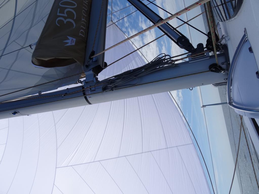 Ce bateau comporte l'option "grand prix" avec des voiles en DCX : génois de 34,5 m², GV de 34,5 m² soit une surface au près de 60 m², et un code 0 de 50 m² pour le petit temps.