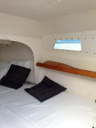 bjr je trouve ce bateau formidable au tan pour la place qu il y a dans les cofres 7 inter qu exter 3 et aussi la place dedant pour dormir et manger j ai fais une petite table que je fixe avec 4 pieds et l on mange assie 4 et il tients la mer par vent de force 3 ou 4 au dela je n ais pas essayé..... merçi